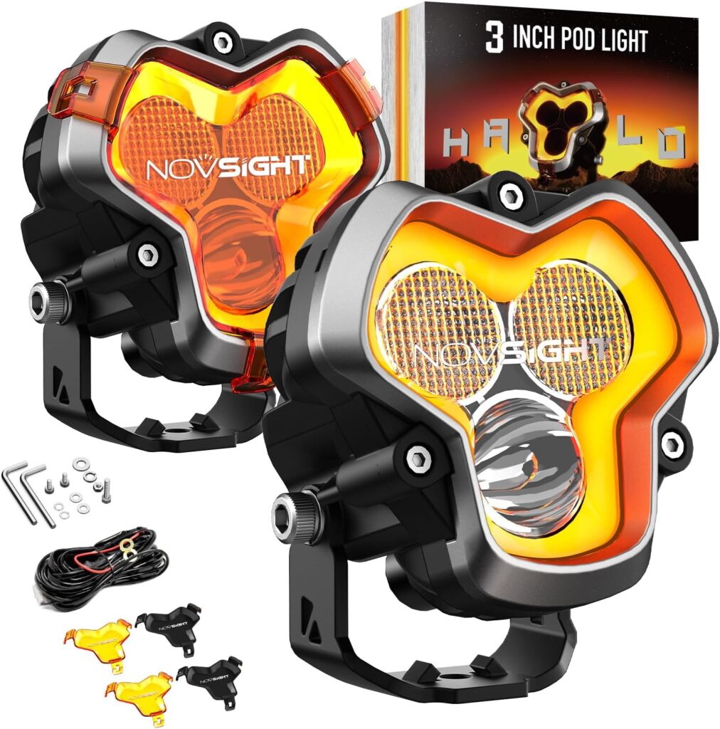 NOVSIGHT 3 Inch LED Pod Lights – Halo Pro Series LED Spot Flood Beam Combo w/Dynamic DRL Modes, 120W Ultra Bright Off Road Light for Truck Jeep Pickup Ford ATV UTV, 2PCS(Red Dot Award 2025 Winner)